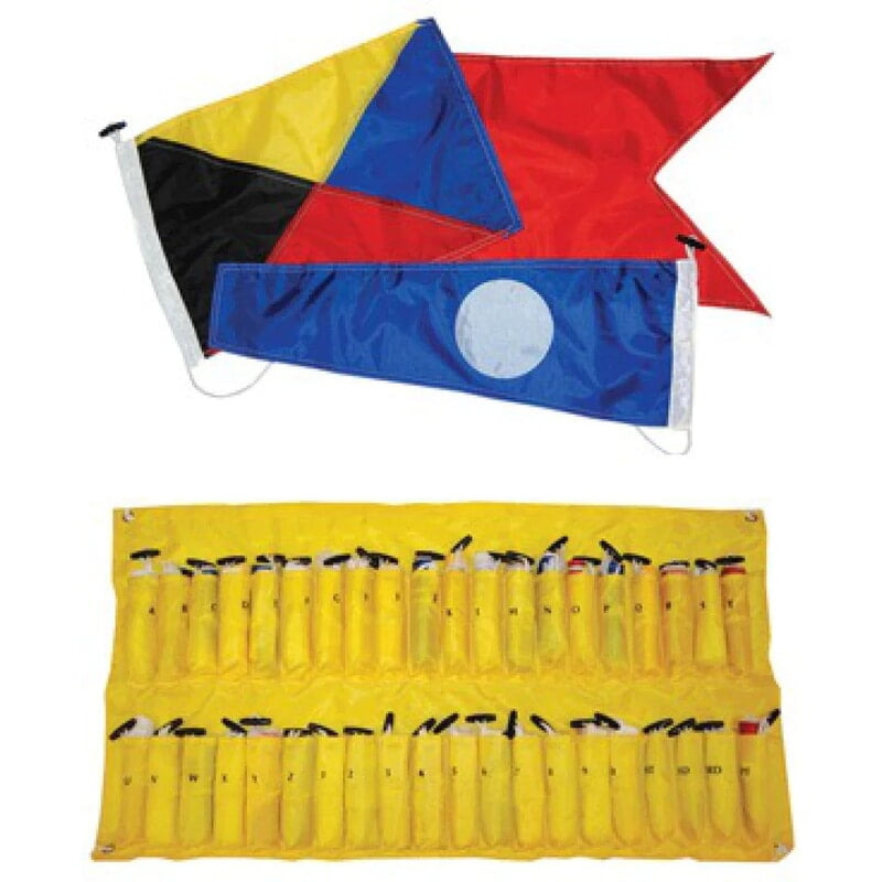 Set of 40 flags (18 x 24") - 26 letters, 10 numerals and four substitutes. They are made of hard-wearing nylon, with fray-resistant hems, an eyelet and tying line. The flags slip away into identified pockets in a neat nylon roll.